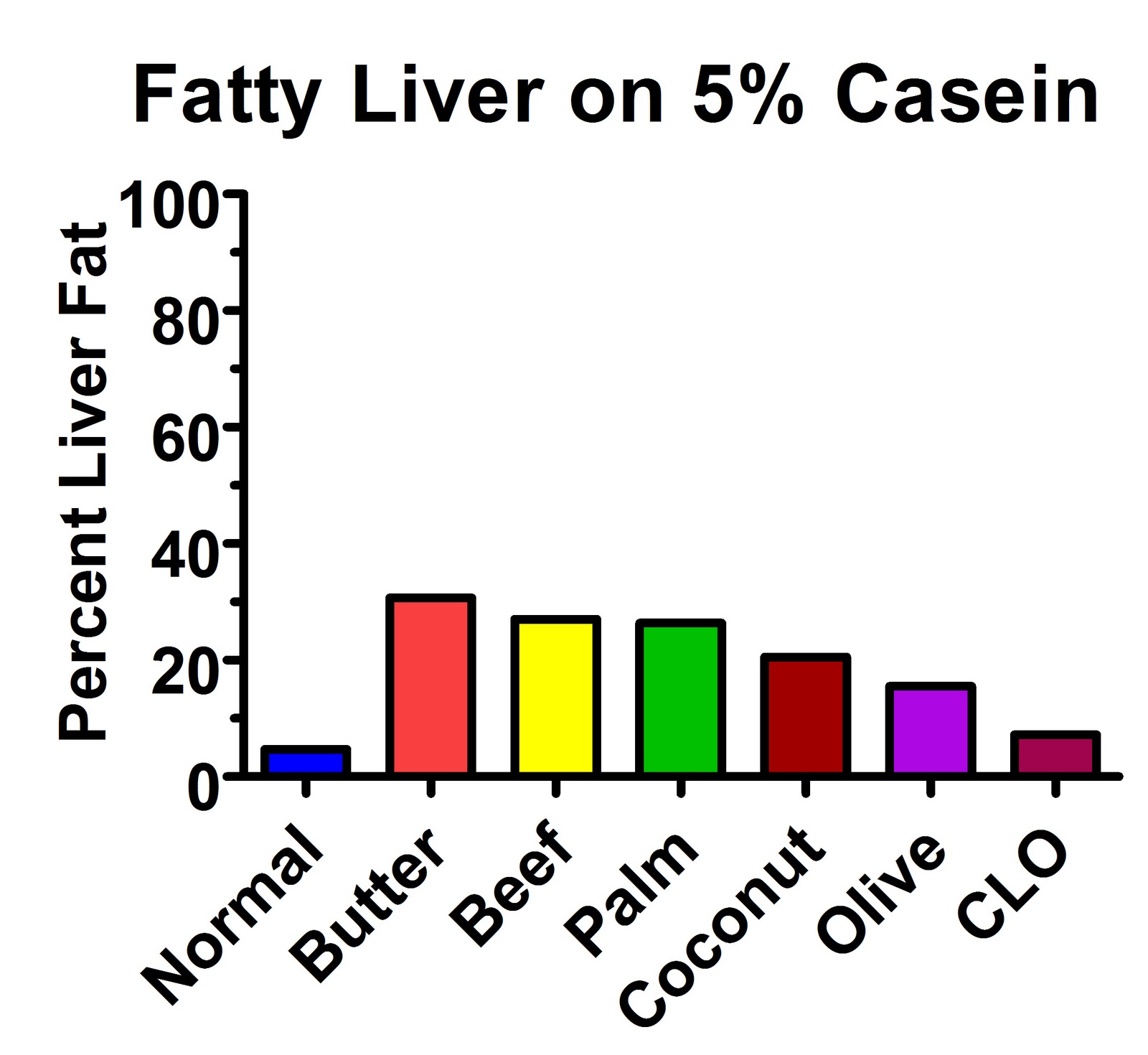 The butter produced the worst fat accumulation, where almost a third of the liver was fat! The animals taking cod liver oil tended to eat a bit less food than the others, which undoubtedly confounded the results at least to some degree, but it still seems from this graph that the more saturated the fat and the longer-chain the fat, the worse the fatty liver was. In fact, if we blow up the graph, we can see this more easily: